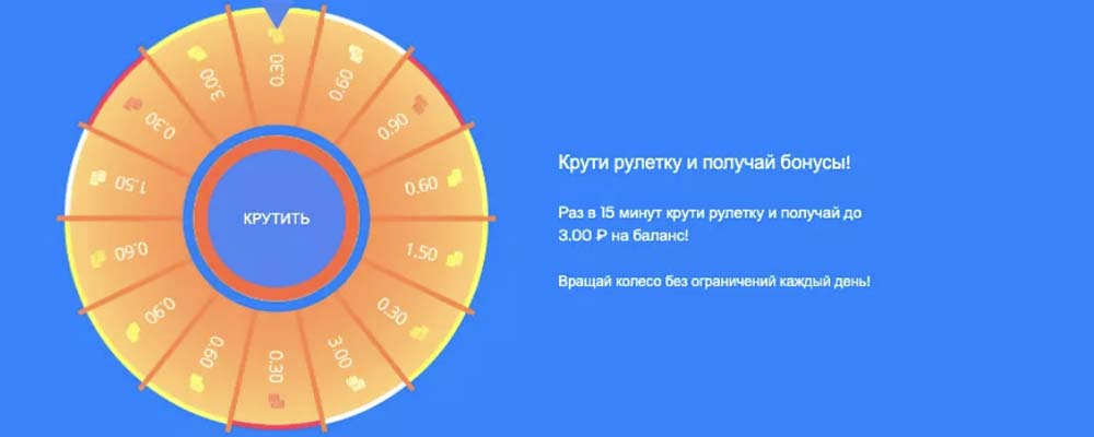 - ежедневный reload – вращение Колеса Фортуны каждые 15 минут с возможностью получения до 3 RUB.